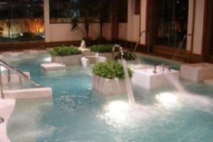 金汤国际温泉度假村。熏拥有营业面积两万多平方米,是一家时尚温泉度假村。其中户外水疗占地一万多平方米,集欧美日及台湾地区等十二大主题温泉泡汤、八大水疗设施、集推拿足按、美容美体、游泳健身、药膳饮食、娱乐休闲于一体的时尚SPA主题度假村,提供汤屋、棋牌室。室内外的演艺节目、教授瑜伽、专人指导泡汤、健身房等一